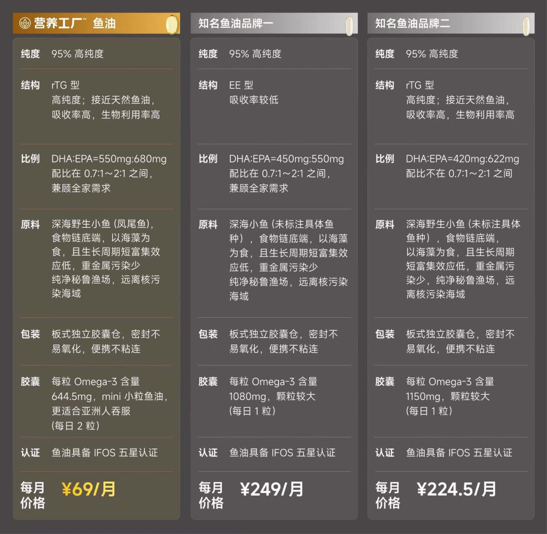 比如他们的鱼油,95%高纯度,国际IFOS权威认证,同品质的市面上要大几百,他们一个月下来只要69。
