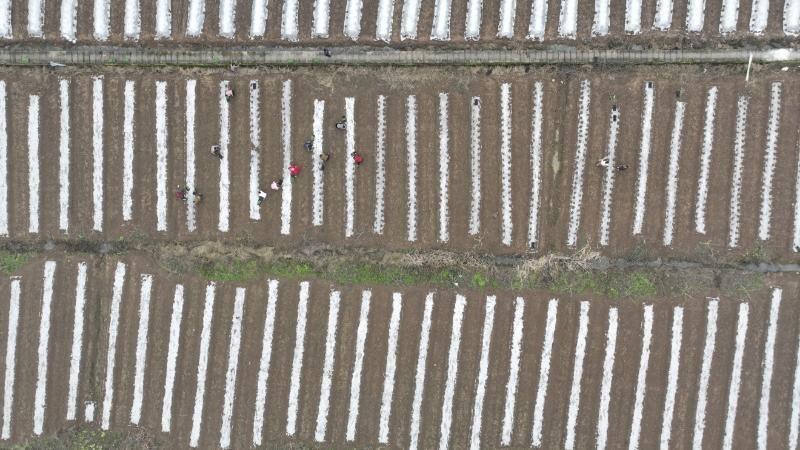 种植田间,随处可见工人们忙碌的身影。打孔、施肥、栽苗、扶苗、覆土、压实……一道道工序衔接紧密、有条不紊。一株株新栽的幼苗整齐排列,嫩绿挺拔,在春日阳光下焕发着盎然生机。