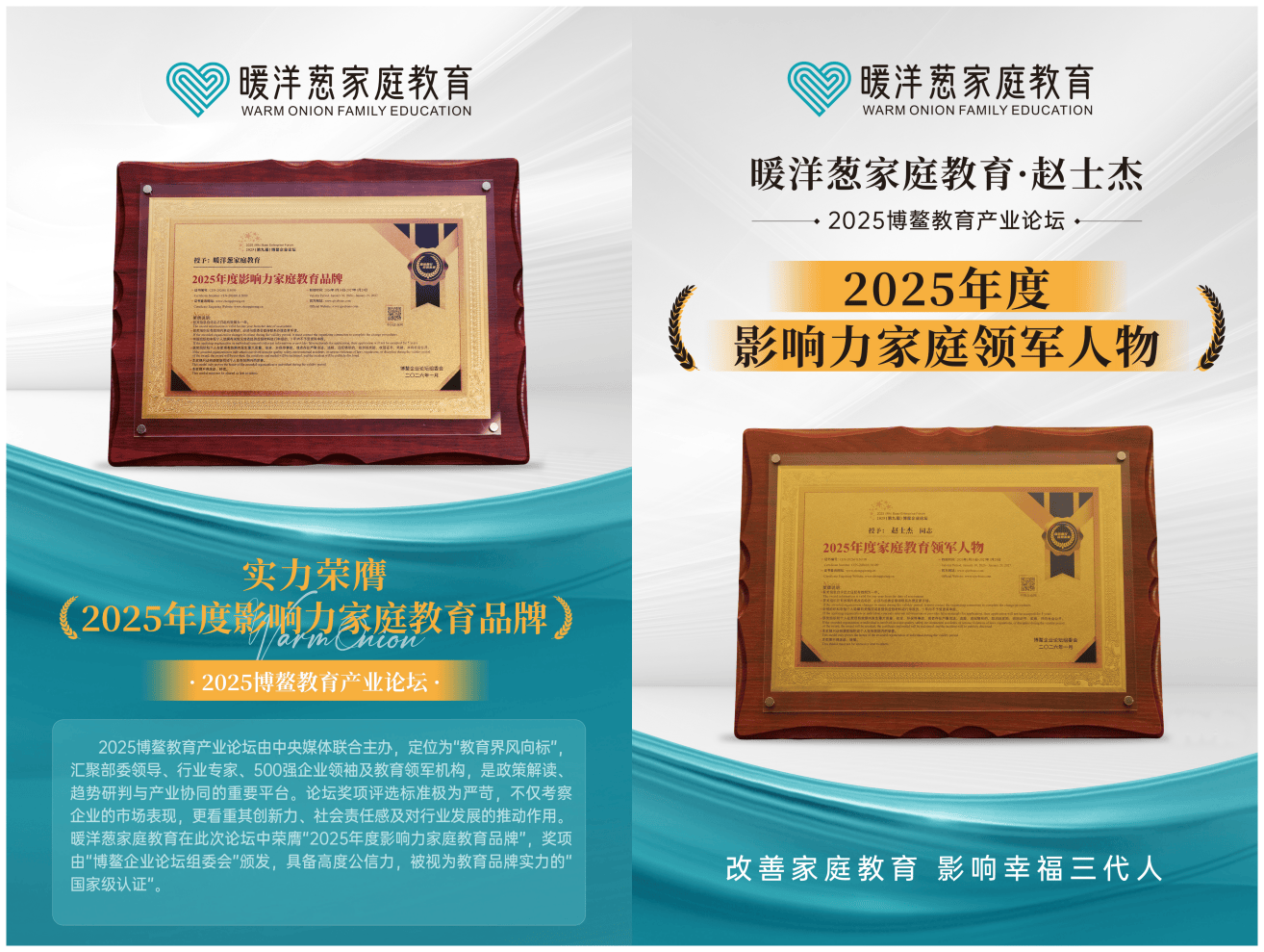 近日,备受瞩目的2025博鳌教育产业论坛在海南博鳌隆重举行。这场以“向新而行 质领未来”为主题的年度思想盛宴,不仅汇聚了政府领导、专家学者及行业领军企业,更成为了检验中国教育品牌实力的最高“秀场”。在这一代表着行业发展风向标的顶级盛会上,暖洋葱家庭教育凭借其卓越的品牌影响力与深厚的专业积淀,从众多参评机构中脱颖而出,一举斩获“2025年度影响力家庭教育品牌”大奖;暖洋葱家庭教育研究院院长赵士杰老师亦凭借其在青少年心理与家庭教育领域的杰出贡献,荣获“2025年度影响力家庭教育品牌”殊荣,载誉而归。