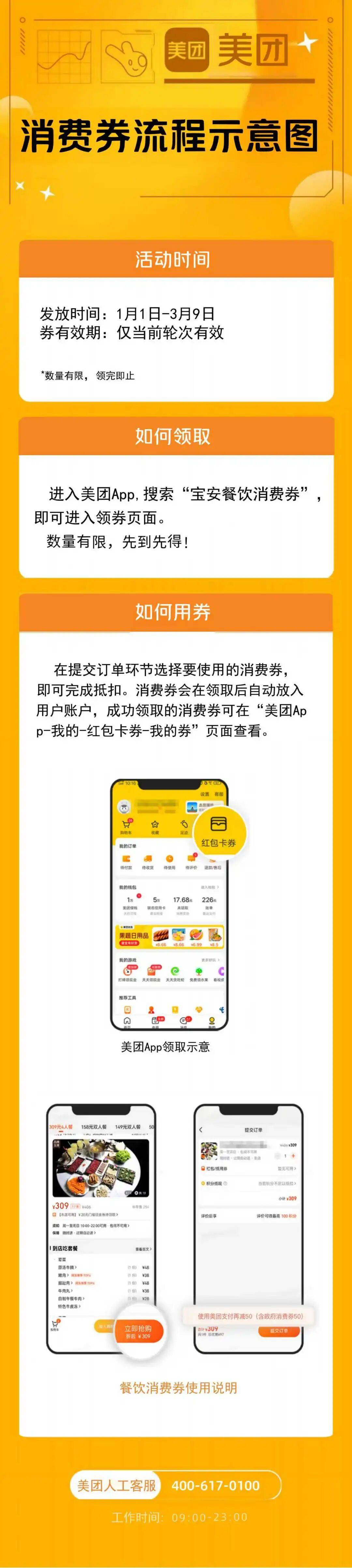 所有消费券领取后仅当前轮次有效,逾期自动作废。用户进入美团APP,搜索“宝安餐饮消费券”即可进入领券页面。所以,在享用新年大餐之前,可千万记得抢券呀,有量有限,先到先得哦!