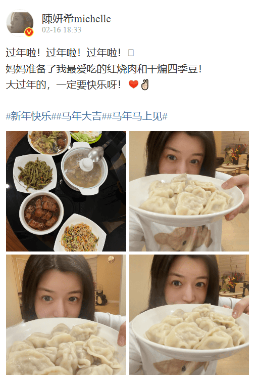 在2月16日,陈妍希晒出年夜菜,除夕夜和妈妈一起守岁,还配文三个过年啦!,妈妈准备了自己最爱吃的红烧肉和干煸四季豆,大过年的,一定要快乐呀!看到这么鲜活的陈妍希真的让人开心,把儿子亲自送到陈晓家去过年,知道男方家比较在意这个。